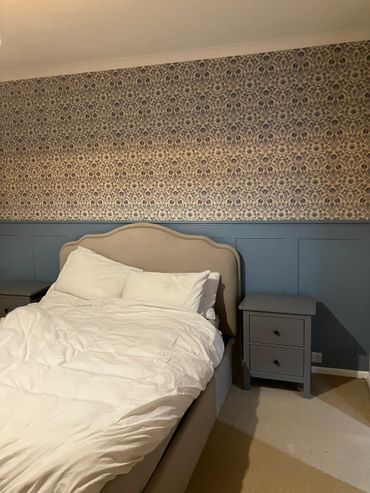Bedroom in Dane Hill redecorated with a feature wall in a patterned wall paper